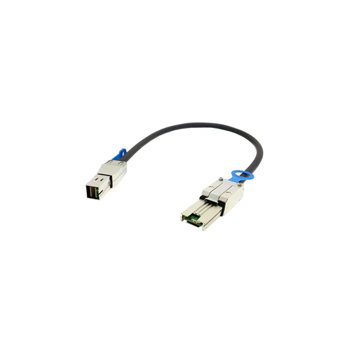 Les interfaces SAS (Serial Attached SCSI) et SAS HD (Serial Attached SCSI Haute Densité) sont des technologies conçues principalement pour le transfert de données vers et à partir de dispositifs de stockage sur disques ou bandes magnétiques. L’interface mSAS (Mini Serial Attached SCSI) et SAS HD (Serial Attached SCSI Haute Densité), offrent une taille de connecteurs réduite et des débits d’interconnexions accrus. Les câbles miniSAS – miniSAS HD d’IBM ont été développé en utilisant du câble cuivre twin axial dont les propriétés fournissent des améliorations significatives de vitesses de transferts à 12 Gb/s et d’intégrité des signaux. Les câbles miniSAS sont disponibles pour des applications SAS internes et SAS externes.