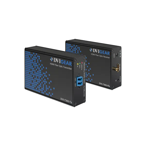 Le DVIGear DVI-7360 est un système de déport fibre optique HDMI 1.4 et DVI 1.0 haut débit compatible HDCP 1.4, capable de distribuer des signaux HDMI ou DVI haute résolution sur des longueurs allant jusqu'à 350 mètres tout en conservant une qualité d'image parfaite. Un signal d'entrée HDMI provenant d'une source tel qu'un décodeur ou un lecteur Blu-Ray est converti en signal optique par un module émetteur pour une transmission LC/LC. Du côté de l'affichage, un module récepteur reconvertit les impulsions optiques en un signal HDMI pour l'affichage sur un moniteur ou un projecteur.