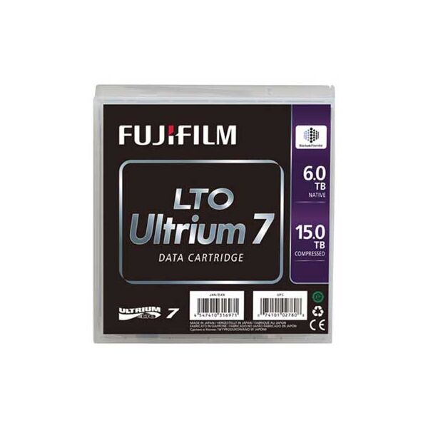 La cartouche de données Fuji LTO Ultrium 7 permet de sauvegarder et d’archiver de grands volumes de données à la vitesse exceptionnelle de 750 Mb/s (données compressées) et offre une capacité de stockage de 15,0 Tb de données compressées (6.0 Tb en natif). La bande magnétique LTO7 de Fuji est idéale pour stocker économiquement de grandes quantités de « donnés à froid » grâce à sa grande capacité et la possibilité de stocker des données pour plus de 30 ans.