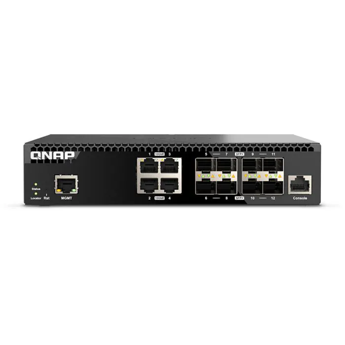 Le QNAP QSW-M3212R-8S4T est un switch administrable de niveau 2 conçu pour les environnements professionnels nécessitant une connectivité 10GbE hybride. Il est équipé de 12 ports 10GbE, dont 8 ports SFP+ pour les connexions fibre et 4 ports RJ45 pour la connectivité cuivre.