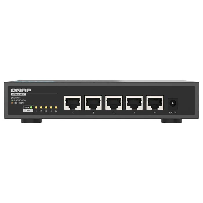 Le QNAP QSW-3205-5T est un commutateur non administrable conçu pour répondre aux exigences des infrastructures réseau multi-Gigabit. Il intègre cinq ports NBASE-T RJ45 prenant en charge des vitesses de 10GbE, 5GbE, 2.5GbE, 1GbE et 100MbE, assurant une compatibilité optimale avec les équipements réseau récents et existants.